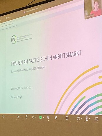 In ihrem Online-Vortrag sprach sie über die Lage von Frauen am sächsischen und bundesdeutschen Arbeitsmarkt und kam mit uns ins Gespräch.